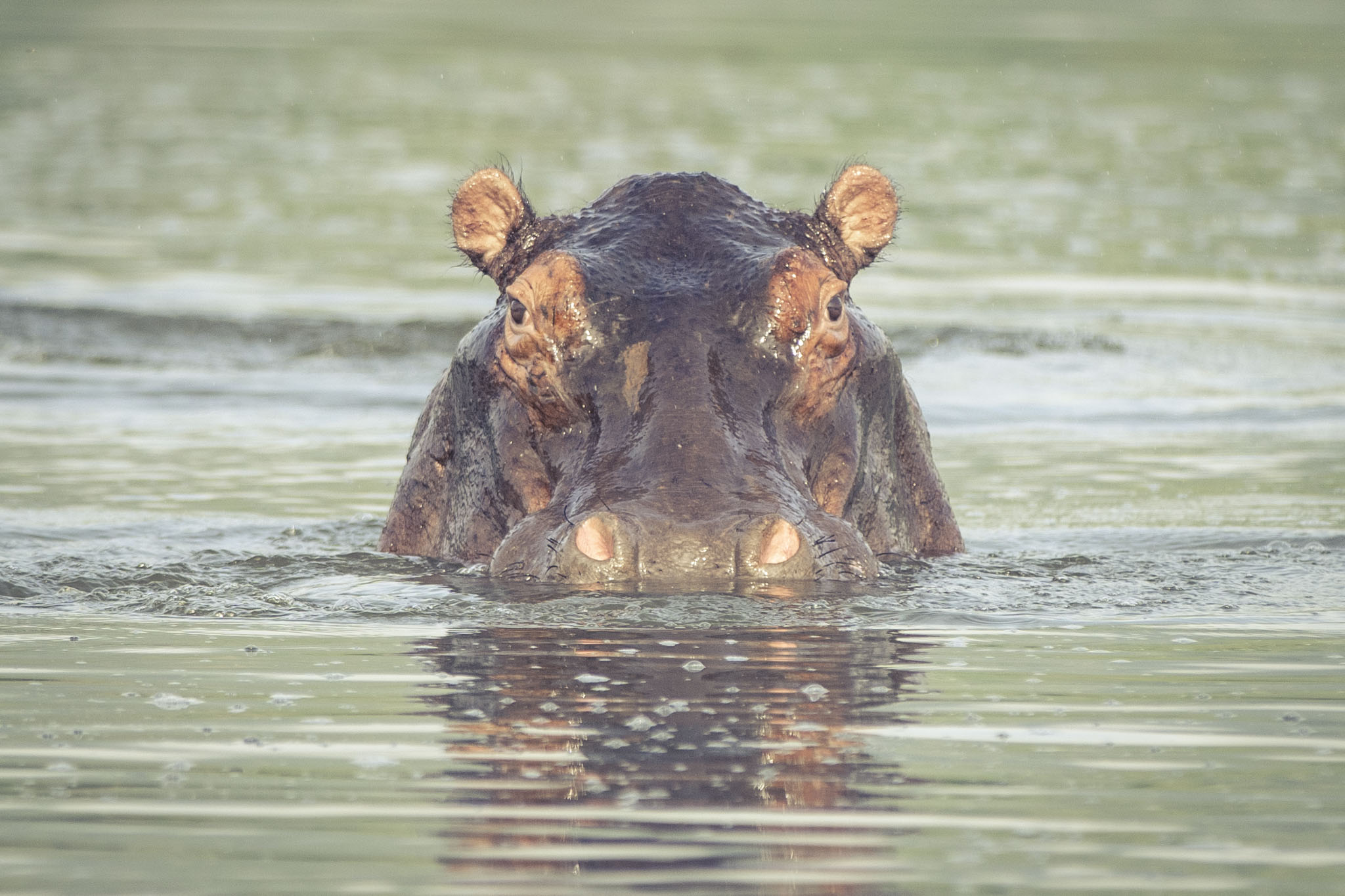 hippos in the water and crocodiles by the shores of the lake. There are